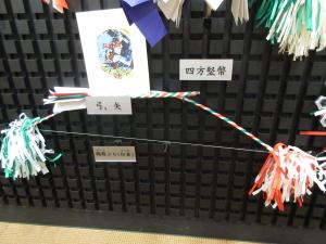 大元神楽の舞台となる舞殿は八畳の広さで、神事、神楽舞もこの八畳の中で行われます。周囲の長押しの切り飾りは、それぞれ四季を表しています。舞殿は東の元山、西の端山にそれぞれ俵(山の俵)を配して、地域の様々な神々を勧請します。