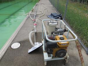 <ポンプにつないでゴミを吸引します。吸引後はプール内に入り、壁をこすります。こうしたことを3週間程度繰り返します。>